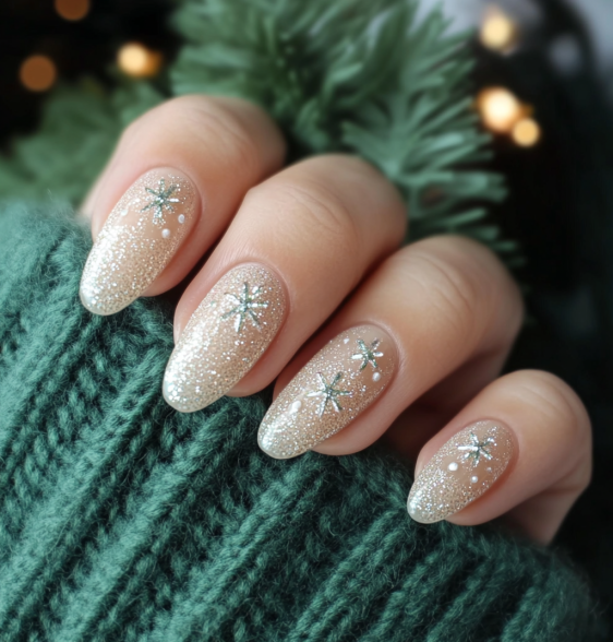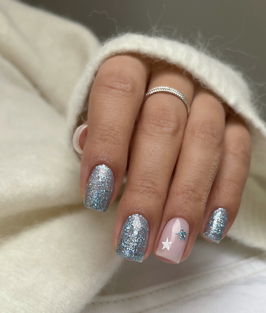 🌟 Elegant Beige Nails with Silver Glitter Stars 🌟