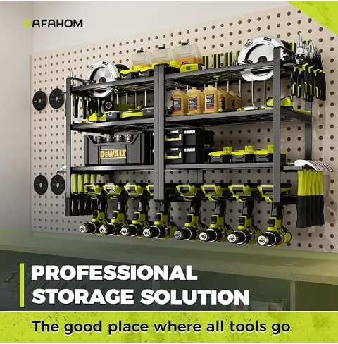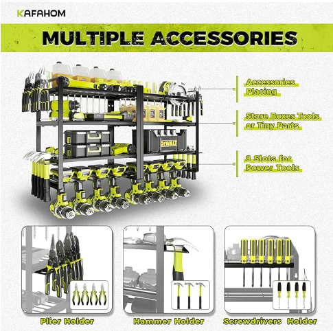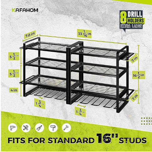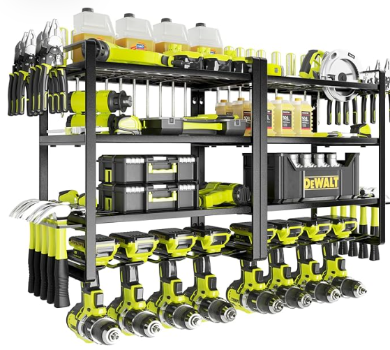 This is wall-mounted storage rack features 8 drill holders and 4 layers for organizing your garage tools.